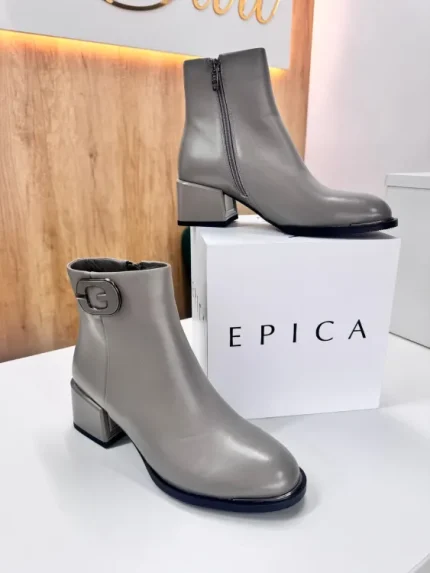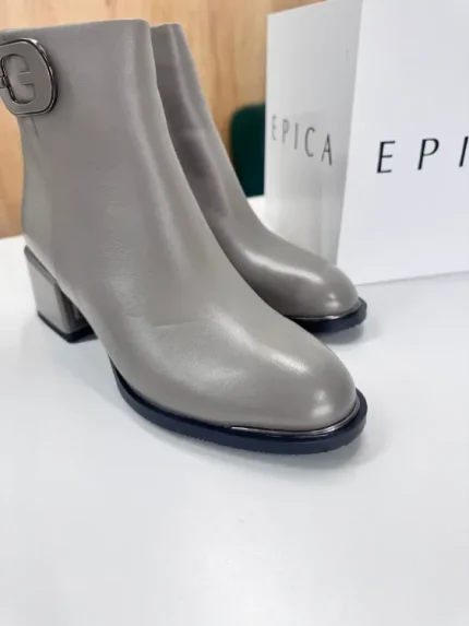 Ghete scurte, stil botină, ideale pentru confortul de zi cu zi. Sunt confecționate dintr-un material cu aspect granulat, în nuanța neutră de Maro-Tau. Prezintă un toc mic, tip bloc, care asigură stabilitate. Detaliul principal este bareta decorativă cu element metalic discret, care înconjoară glezna. Se închid cu fermoar lateral.