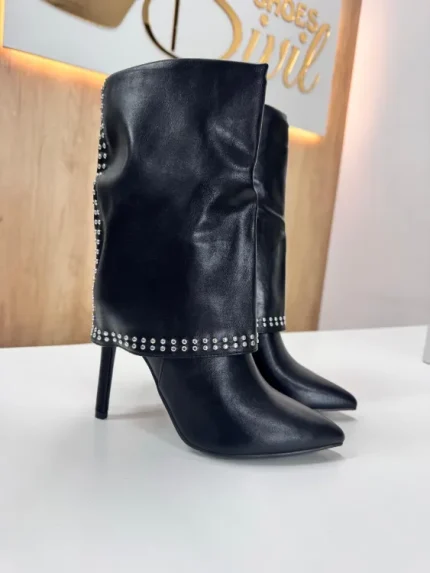 Îndrăznește cu aceste botine care îmbină eleganța și atitudinea rebelă. Realizate dintr-un material cu aspect de piele, se disting prin manșeta ajustabilă slouchy (întoarsă) și șirurile de aplicații metalice (ținte) care conturează marginea și spatele. Tocul stiletto și vârful ascuțit asigură o alură senzuală, transformând orice ținută de seară într-un look de impact.
